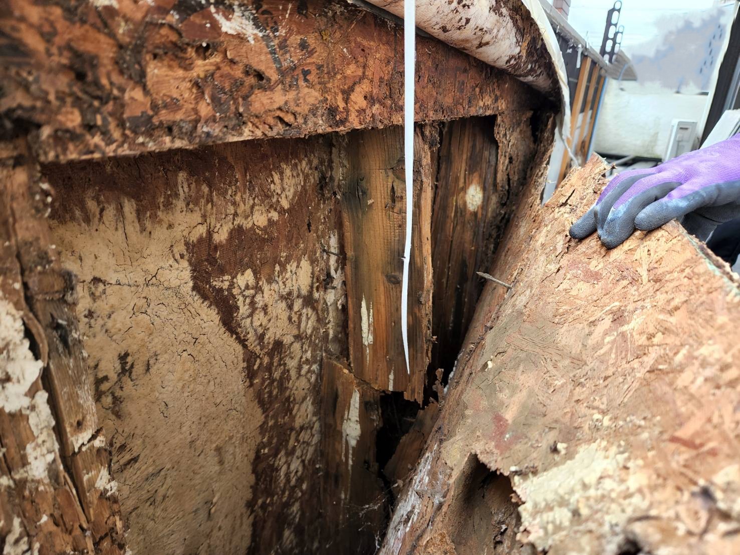 - 被害箇所の特定: 専門業者と共に、2階で白アリが確認された場所だけでなく、その周辺の壁、床、天井などを丁寧に(ていねい)に調査し、被害の範囲を特定します。